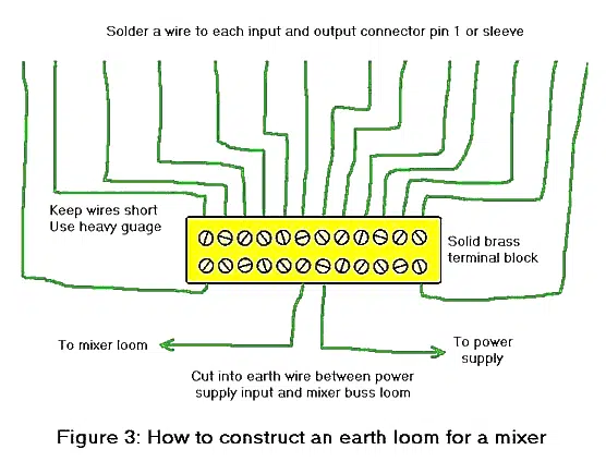 All mixing consoles, bar the most expensive, run unbalanced mix busses inside. This makes them very susceptible to induced noise from earth currents running through the mixer. If your mixer has dubious earthing (ie if you can’t see an earthing loom like the one described in Figure 3) even if it’s double insulated, you can try installing an earth loom as illustrated. Note: this will NOT eliminate induced noise problems, but it will reduce them substantially.